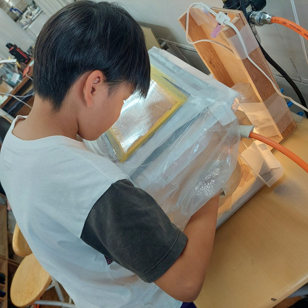 小学校1年生でもサンドブラスト機で自分で彫ることができます。